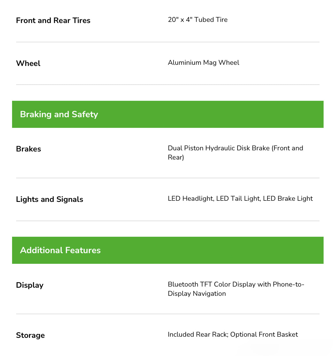- Dual-piston hydraulic brakes deliver confident, stable stopping even with two riders or heavy cargo.