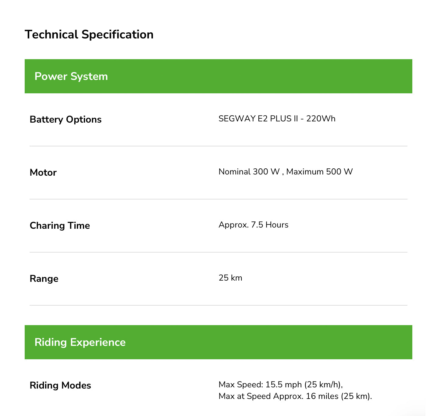 Riding mode / speed: Max Speed: 15.5 mph (25 km/h),